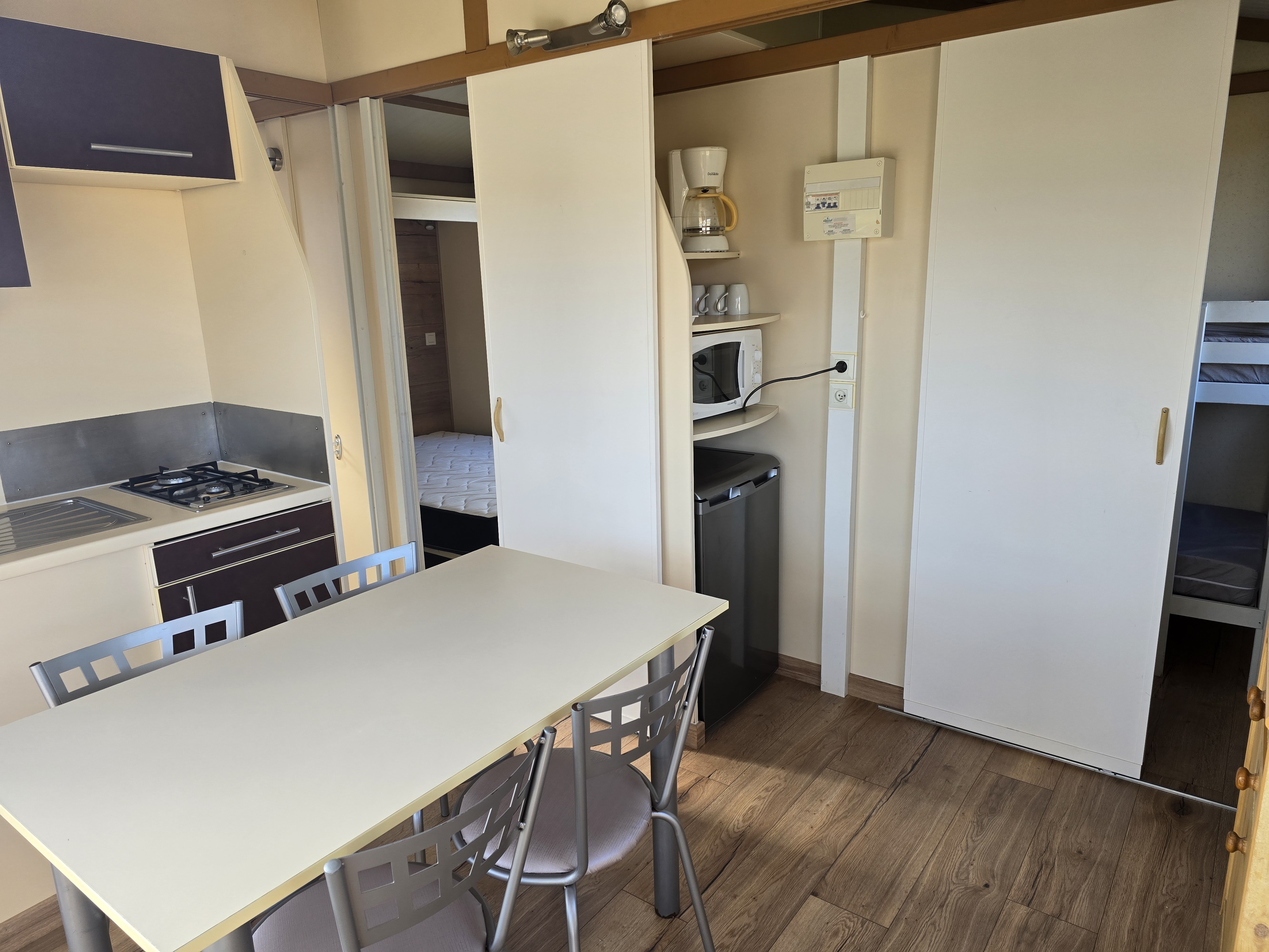- Coin cuisine avec 2 plaques électriques, évier égouttoir, réfrigérateur, micro-onde et placards.