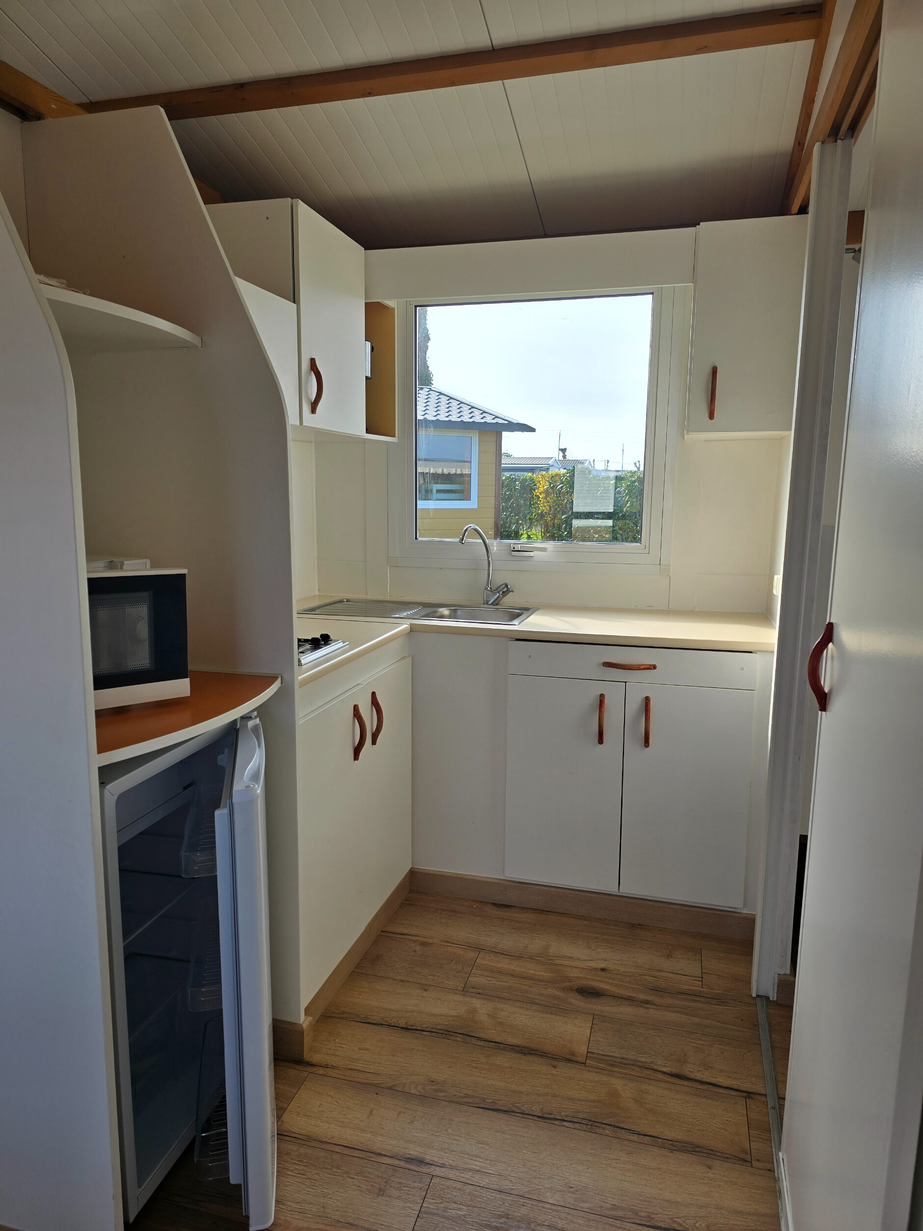- Coin cuisine avec 2 plaques électriques, évier égouttoir, réfrigérateur, micro-onde et placards.