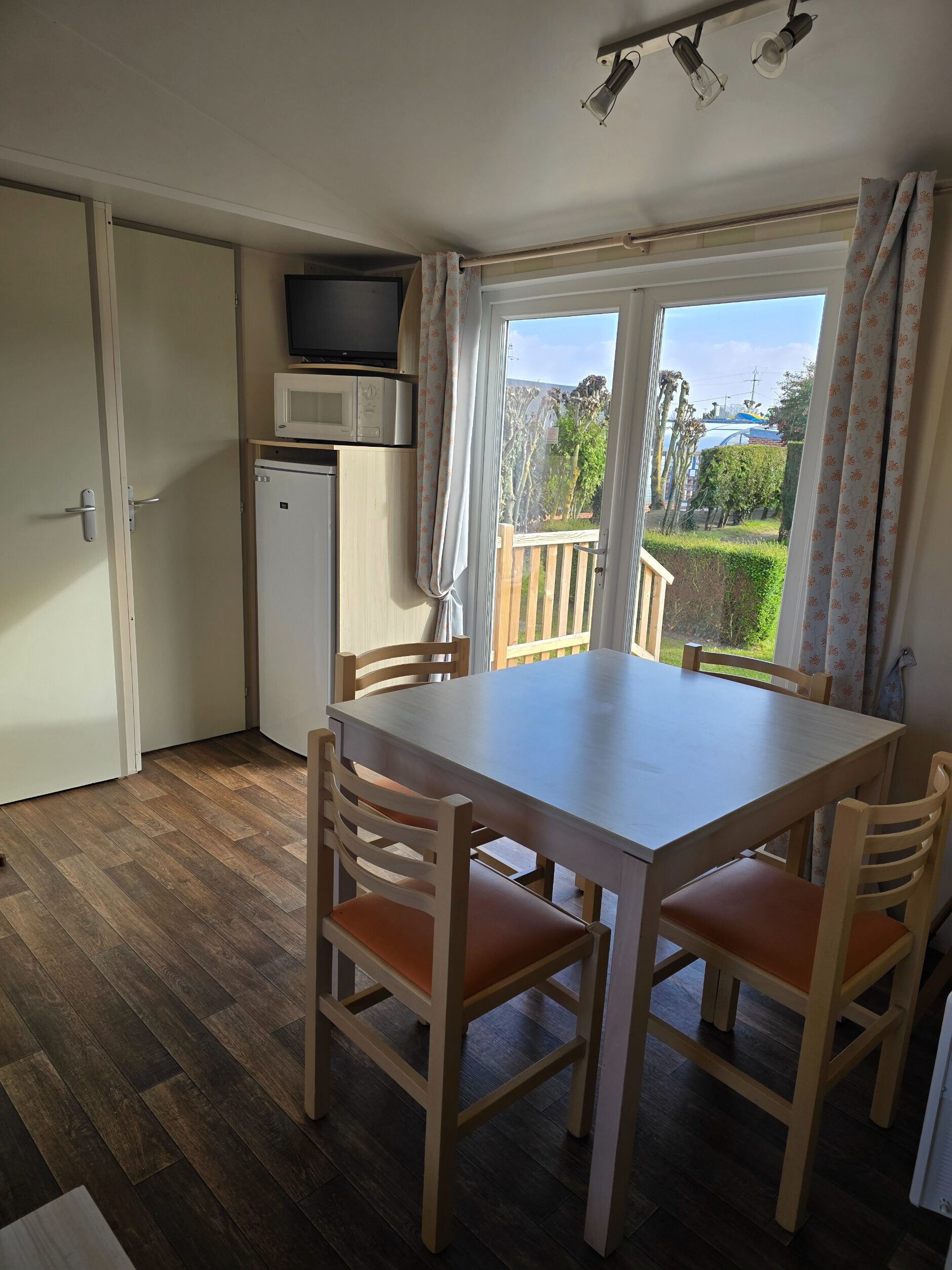 - cuisine ouverte sur séjour avec bar, toute équipée, réfrigérateur-congélateur, gazinière, hotte, ustensiles de cuisine, four micro-ondes…